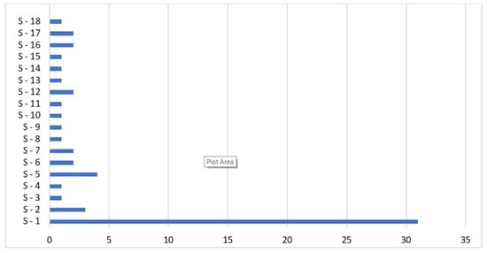 Figure 7 shows 18 different species that were used by the researchers in this study, such as (1) Moso (Phyllostachys pubescens/Phyllostachys edulis), (2) Hong (Phyllostachys iridencens), (3) Phyllostachys viridiglaucecsens, (4) Phyllostachys family, (5) Guadua angustifolia kunth a.k., (6) Bambusa vulgaris, (7) Tregai (Bambusa stenostachya), (8) Dendrocalamus strictus, (9) Ater (G. atter), (10) Makino (Phyllostachys makinoi), (11) Pseudosasa amabilis, (12) Bambusa Balcoa, (13) Madake (Phyllostachys bambusoides), (14) P. aurea, (15) Dendrocalamus giganteus, (16) Dendrocalamus asper, (17) Schizostachyum Grande, and (18) Gigantochloa Scortechinii. It can be seen that most of the researchers used Moso bamboo in their study. This paper will use “S” to stand for species and numbers “1–18” for the specific type as discussed (e.g., S-1, Moso (Phyllostachys pubescens/Phyllostachys edulis). Moso bamboo stands out as the globally predominant bamboo species in terms of widespread harvesting [], temperate bamboo species which basically grows in China [] and performs better compared to other species both environmentally and mechanically [].