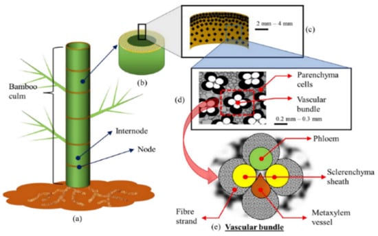 Typical bamboo anatomy: (a) the whole bamboo culm in its natural state, (b) a cross-section of the bamboo showing its internal structure, (c) a close-up view of the cross-section area, (d) a magnified view of the parenchyma cells and vascular bundles, and (e) an enlarged view of a vascular bundle, Figure is reproduced with permission from [], Elsevier, 2022.