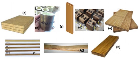 Samples used for testing the bamboo properties: (a) BSCL [], (b) bamboo tube [], (c) MBS, (d) scrimber, (e) OBFRC, (f) bamboo slivers, (g) LBL, (h) UBSBs. All figures are reproduced with permission from (a) BSCL [], Elsevier, 2021; (b) bamboo tube [], Elsevier 2019; (c) MBS [], Elsevier, 2023; (d) Scrimber [], Elsevier, 2016; (e) OBFRC [], Elsevier, 2020; (f) bamboo slivers [], Springer Nature, 2023; (g) LBL [], Elsevier, 2016; and (h) UBSBs [], Elsevier, 2018.