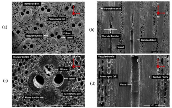 Bamboo microstructure was widely studied by the different researchers. Bamboo is a radially graded, transversely isotropic composite material []. The microstructure of bamboo can vary among different bamboo species and culm regions. The arrangement and characteristics of the vascular bundles, parenchyma cells, and fiber strands impact the overall mechanical behavior and physical properties of bamboo. Figure 10 shows the scanning electron microscope (SEM) images of raw bamboo culm with different constituents []. It is a zoom-in view of the vascular bundles of bamboo along with the parenchyma cells. The SEM images of bamboo are shown in Figure 10. Dixon et al. [] investigated three different bamboo species: Moso, Guadua, and Tregai. They observed that Moso and Tre Gai exhibited similar volume fractions of fibers and similar variations across the culm wall, whereas Guadua generally had a higher fiber volume fraction but a similar distribution. The average fiber volume fractions obtained for each species were 0.20 for Moso, 0.33 for Guadua, and 0.16 for Tre Gai. The variation in the density of Moso bamboo can be attributed to the distinct proportions and growth patterns of its vascular bundle tissues and parenchyma ground tissues []. The volume of lumen in parenchyma tissue was significantly reduced, resulting in a nearly uniform distribution instead of gradually changing along the thickness direction []. Lee et al. [] examined the structure of Moso bamboo subjected to heating treatment and found that bamboo treated at higher temperatures experienced significant damage to its tissue structures, especially the parenchyma cells. Through FTIR spectroscopy, they observed that as the treatment temperatures increased, the intensity of characteristic absorption peaks of polysaccharides decreased while the intensity of lignin peaks increased. Yang et al. [] performed an alkali pre-treatment method of 6% Sodium hydroxide (NaOH) on Moso bamboo, which aimed to remove the hydrophobic layer from bamboo surface and improve the permeability for the main treatment which is the impregnation of two types of rosin such as epoxy-modified and natural rosin. The study found that by modifying rosin with epoxy, it was possible to fill the cell lumens of bamboo, including the small nanopores in cell walls and spaces between cells. This filling of the bamboo’s structure resulted in improved dimensional stability, with a decrease in swelling by 33.74%. The modified rosin also enhanced the hydrophobicity of the bamboo, as indicated by an increased contact angle and a reduction in water absorption by 24.73%. The modified rosin physically filled the vessels, parenchyma cells, and other structures of the bamboo after impregnation. Ramful et al. [] studied Madake bamboo and conducted smoke treatment to the culms and found that bamboo showed an increase in lignin content at a specific peak of 1114 cm−1. This increase was due to the thermal effect of temperatures above 100 °C, resulting in poly-condensation reactions.