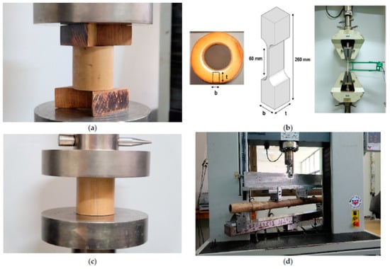 (a) shear strength test, (b) tensile strength test, (c) compressive strength test, (d) four-point bending test. All figures are adapted with permission from [], MDPI, 2021.