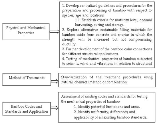 Bamboo is the building material of the past and future. It offers numerous properties that make it versatile for various applications, including construction. Its impressive strength-to-weight ratio enables it to bear substantial loads and stresses, while its good elasticity allows efficient energy absorption. However, its mechanical properties can vary based on factors such as species, age, locations, methods, and treatment. Treating bamboo is essential to enhance its properties and durability. The literature provides various natural and chemical treatments that enhance some of the properties but also reported drawbacks regarding higher temperature, content, and duration. This paper reviewed 57 articles from the Scopus database, specifically focusing on article–document-type publications from the years 2003 to 2023. Additional references were also incorporated to address concerns in properties, treatment, and standards to provide systematic understanding. With extensive assessment of the articles, the following gaps and concerns were observed, and recommendations for further study and assessment were made: the bamboo’s properties, the development of centralized guidelines and procedures for the preparation and processing; the exploration of alternative materials to reinforce bamboo without compromising its ductility; and the development of joint connections, and testing of mechanical properties considering seismic, wind and vibration. For treatment methods, the standardization of procedures using natural, chemical, or a combination. Lastly, for bamboo codes and standards, the assessment of existing codes and standards for testing the mechanical properties of bamboo, highlighting the potential limitations and areas, uniformity, and differences with all existing similar standards. By filling these gaps, it can support the reliability and robustness of bamboo as a sustainable material, fostering its promotion and adoption in the construction industry.