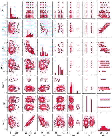 It is well known that the deterioration of concrete’s performance due to frost damage is a complicated process [,,,]. Several experiments have been performed in accordance with the above standards to look at how the properties of frost-damaged concrete change over time. However, it is hard to find a model that can be used for all of the laboratory experiments, even when the standards are not followed exactly. In order to make a good prediction model that can account for differences in materials and experimental tests, this paper collected 155 sets of test data as a database [,,,] and utilized ML models to predict the strength reduction in concrete under frost attack. The input variables used in this study are the number of FTCs, initial compressive strength (CS), water–cement ratio (W/C), maximum temperature during each FT cycle (Max T), minimum temperature during each FT cycle (Min T), and air-entrainment (AE). The output variable is the DCS under frost attack. For the air-entrainment type, ‘0’ and ‘1’ represent non-air-entrained and air-entrained frost-damaged concrete, respectively (see Appendix A).