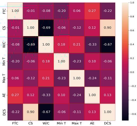 The Pearson correlation coefficient, which assesses the link between inputs and outputs, is a significant and frequently used indicator in the design of ML models. Therefore, this coefficient was developed to examine the inter-dependency and multi-collinearity between six input variables and one output parameter. The Pearson correlation coefficient has a range of −1 to 1. The values close to 0 represent weaker correlations, while values close to −1 and 1 indicate stronger negative and positive correlations, respectively. As shown in Figure 2, moderate to strong correlations exist between the input variables FTC, CS, W/C ratio, Max T, Min T, and AE and the output variable DCS, suggesting these variables have good predictive relationships.