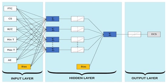 In general, an ANN model’s architecture significantly impacts its efficiency, but there is no standard method of comparison. Consequently, trial and error methods are frequently utilized. In the present study, a three-layered feedforward network with a back propagation algorithm was employed. One hidden layer consisting of 5 to 15 neurons was considered as shown in Figure 4. The rectified linear unit function and the identity transfer function were applied for the activation functions of the hidden and output layers, respectively. Due to the random selection of initial weights and biases, 10 iterations of each model were conducted to discover the ideal one.