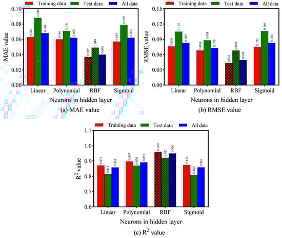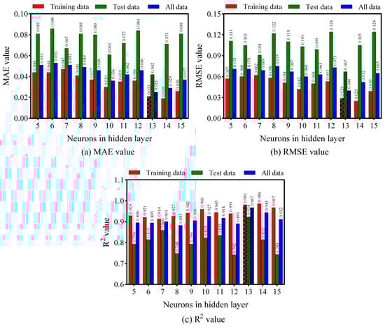 Different ANN model architectures were compared in terms of their performance, as shown in Figure 5. It can be seen that the ANN model with 13 neurons in the hidden layer exhibits an excellent efficiency with the lowest MAE (0.021 for the training data, 0.0420 for the testing data, and 0.025 for all data) and RMSE (0.029 for the training data, 0.067 for the testing data, and 0.04 for all data), and the highest R2 (0.981 for the training data, 0.924 for the testing data, and 0.967 for all data).