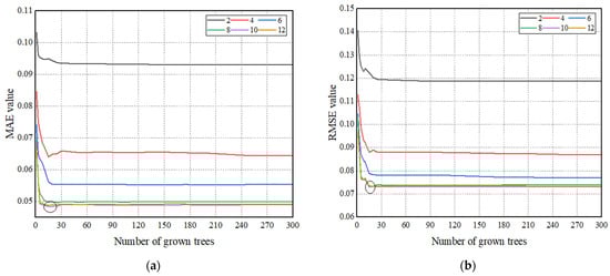 In this study, the number of grown trees varied from 1 to 300, and six different maximum depth of tree values were introduced as 2, 4, 6, 8, 10, and 12. The MAE and RMSE were used as performance indicators to find the ideal number of grown trees and leaf size. Figure 6 depicts the change trend graphs of MAE and RMSE to calculate the optimal number of grown trees and the maximum tree depth. The horizontal and vertical axes represent the number of grown trees and error values, respectively. Based on the detailed analysis, the optimal RF model design consists of 15 grown trees with a maximum depth of tree equal to 10.
