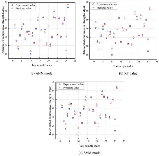 The research presented in this article has significant real-world implications for the construction industry, particularly in cold climate regions prone to FT cycles. By leveraging ML algorithms including ANN, RF, and SVM, the study provides a robust and accurate method to estimate the deteriorated compressive strength of concrete structures. This predictive capability can be applied in real time to evaluate the structural health and safety of existing concrete infrastructure in cold areas. In addition, the implementation of ML techniques can eliminate the need for labor-intensive and costly laboratory tests, making freeze-resistance assessments more accessible and feasible in engineering projects around the world. Furthermore, understanding the effects of environmental factors such as the number of FT cycles, water–cement ratio, and minimum temperature on frost resistance allows engineers and architects to make more informed decisions when designing durable, long-lasting concrete structures. As a result, this study provides engineers with valuable insights, paving the way for more efficient and trustworthy methods of assessing the frost resistance of concrete. Ultimately, this research contributes to the sustainable growth and environmental resilience of concrete structures.