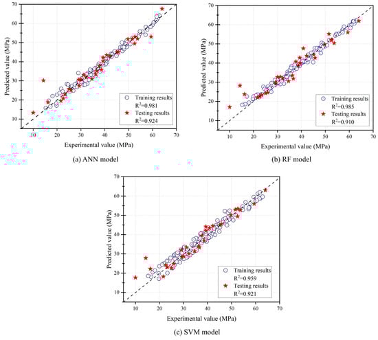 A comparison of the constructed ANN, RF, and SVM models using statistical indices, as illustrated in Table 4, is provided in this section. During the training process, the RF model’s performance surpassed the other models, with the smallest values for RMSE and MAE and the highest value for R2. The ANN model predicted the testing data well, with R2 values equaling 0.924, followed by the SVM model. The SVM model demonstrated superior stability and generalization capabilities with the minimum difference between the training and testing R2 values. The R2 score for the training and testing datasets for the RF model decreased from 0.985 to 0.910, indicating considerable overfitting. The ANN model’s overall performance was superior to that of the SVM and RF models.