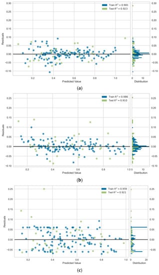 Residual plots of the proposed models. (a) ANN model. (b) RF model. (c) SVM model.