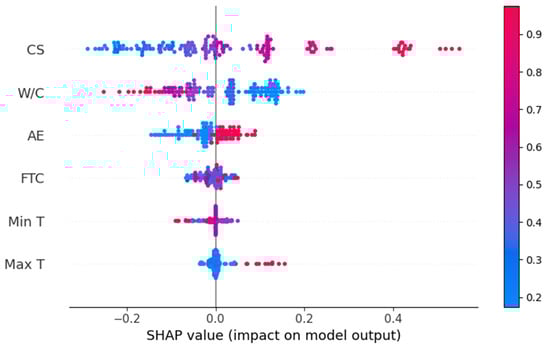 In this study, the Shapley additive explanations (SHAP) approach, which defines how an ML model gives individual predictions, was used to assess the impact of input parameters on the DCS for the ANN model. For each prediction, SHAP calculates how much each model’s input variable has contributed to the output [,]. The relation of different features with the DCS of concrete under frost attack is represented by SHAP values (Figure 11). The vertical axis represents the variable’s name in ascending order of significance. The number to the right of their names is the mean SHAP value. The position of a point along the horizontal axis offers information regarding the effect of a specific feature on the model’s output. Each point in the plot represents a unique instance of the database. The relative value of each attribute is shown by the color bar on the right. For instance, the initial compressive strength of concrete has a maximum SHAP value for the DCS estimate. This demonstrates that concrete with a higher initial compressive strength experiences less strength loss when subjected to frost damage than concrete with a lower initial compressive strength, since a higher initial strength of concrete is often correlated with superior durability due to the high compactness in the structure. Likewise, AE also has a positive impact on the FT durability of concrete. Figure 11 depicts the second-highest SHAP value for the W/C ratio. However, it has a detrimental effect, which means that the compressive strength declined further as the W/C ratio increased. Similarly, FTCs also negatively affect the concrete’s ability to resist freezing. Other attributes such as Min T and Max T have slight but distinct effects on the DCS.