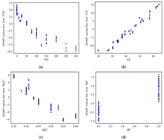 The interaction of different input features with the DCS of concrete under frost attack is depicted in Figure 12. The FTC feature interaction is shown in Figure 12a, illustrating FTC’s negative impact on DCS. Increasing the number of FTCs leads to degradation in concrete strength, resulting in a decreasing trend. Figure 12b illustrates that CS significantly positively impacts the DCS of concrete, and the SHAP values increase as CS increases. The W/C feature interaction is provided in Figure 12c which displays a negative impact of W/C on DCS. Furthermore, AE has a positive effect on DCS because the tiny air spaces created by AE serve as empty chambers for the freezing and migrating water to enter. This allows the pressure in the pores to decrease and stops the concrete from becoming damaged.