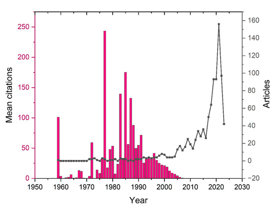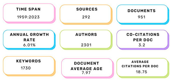 The search was executed in the Scopus database during January 2023, and the data were obtained as .csv files that are interoperable and accepted by various bibliometric software, including Biblioshiny (version 4.1.3), which was utilised in this study [51,52]. The obtained data were curated using Excel, and all outliers, such as dummy information, were removed before processing.