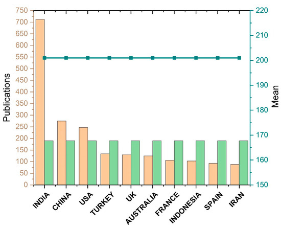 Figure 4 presents the highly productive countries involved in soil stabilisation research, in which India is leading with a publication record of 253 in total, followed by the USA (247), China (67), Turkey (59), and Australia (48). Should someone wish to enhance the amount of collaborative research carried out, one good indicator is to note how many researchers are working in a specific field and the number of publications coming from a given country. Citations are used to understand how familiar a particular article is among peers in the field, and in terms of citations, India had an outstanding record with 3084 citations in total, followed by the USA with 1773 citations (information obtained from the data). However, care should be taken to analyse and understand the nuances of citations since trends are influenced by many parameters, and citation distribution remains highly skewed [53,54]. Also, the highest citation (21.96) was recorded for Iran, despite the country producing only 34 publications.