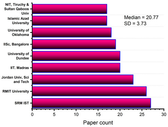 Figure 5 displays the research organisations with the highest research output in the context of this study. All the top ten organisations had more than 10 publications, and the top two organisations had 27 and 26 publications, respectively. The SRM Institute of Science and Technology, with 27 publications, emerged as the top publisher, followed by RMIT University, Jordan University of Science and Technology, and the Indian Institute of Technology Madras, producing 26, 23, and 20 articles, respectively. These institutions are working extensively on stabilisation research and producing a greater number of articles with these keywords.
