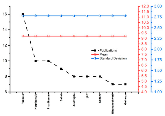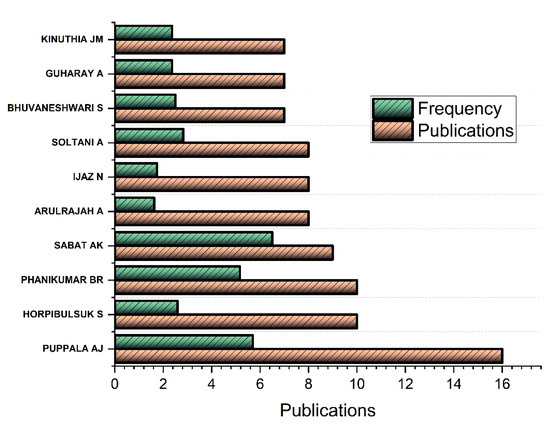 Figure 6 depicts this study’s results on the top ten most prolific authors who contributed to the topics of “soil stabilisation” and “swelling soil” during the period of 1959–2023. These authors have contributed research publications related to these keywords very consistently. Puppala AJ from the USA topped the list with 16 documents and 3084 citations. In addition, Puppala AJ has the greatest h-index, which indicates that he is still, by far, the most influential author in soil stabilisation and swelling soil. The annual average number of citations for a work by Puppala AJ is 5.7. Horpibulsuk S of Thailand is the field’s second-most prolific academic. Horpibulsuk S has authored 10 works and has an h-index of 8. In 2009, Horpibulsuk S published twice in the field of soil stabilisation and swelling soil; between 2009 and 2020, he published 10 articles; he did not publish work in 2022. Our data also demonstrate that Phanikumar BR and ArulRajah A each has an h-index of 8, implying that they have made remarkable contributions to the advancement of engineered soil through soil stabilisation. Figure 7 provides the work of several other notable academics in this area. The productivity of the top 10 authors over the years is illustrated in the following manner: The line represents the author’s publication history; the size of each bubble gives the number of documents produced by the author that year; the depth of the bubble’s colour displays the total number of citations that year; the first bubble on the line shows the year the author first published in the field; the larger the bubble, the greater the number of articles published by the author that year.