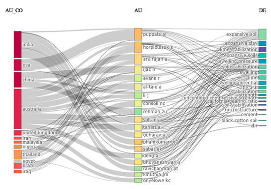 Three-field plot depicting various keywords connected to authors and countries involved in soil stabilisation and swelling soil.