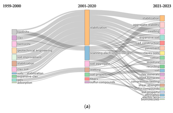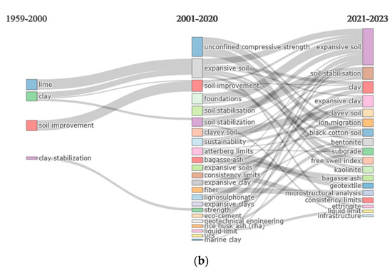 Figure 9 shows the evolution of keywords in two different stages (1959–2000 and 2001–2023). It can be noticed that most of the research in the second stage related to swelling and stabilisation [55]. This has been supported by the height of the boxes and the thickness of the connecting lines during the period of 2001–2023, which demonstrated the increased research focus on these two terms.