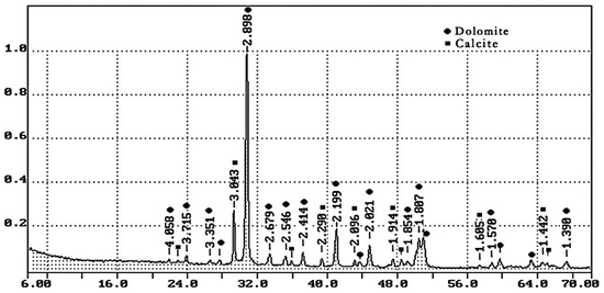It has been established that finely ground dolomite can be used to produce dolomite Portland cement due to its sufficient durability, leaching resistance, carbonation, and chloride penetration [26]. The addition of a dolomite filler causes the formation of hemi- and monocarboaluminate phases and the stabilization of ettringite. Moreover, hydrotalcite is formed in dolomite cement, which occurs at elevated temperatures and long-term hardening. The formation of hydrotalcite in dolomite cement can improve the pore structure of the mortar and, thus, increase its compressive strength [27,28,29].