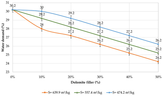 According to the Vicat test, the water demand of cement is equal to a certain amount of water to obtain the standard consistency of cement paste. The data show that despite the presence of the dolomite filler, less water is required to obtain the standard consistency of cement paste (Figure 5). The presence of fine particles less than 5 μm and the widening effect of the filler have a significant effect on the water demand of the binder, which corresponds with the data of other researchers [48].
