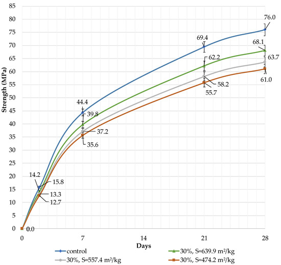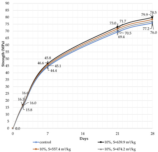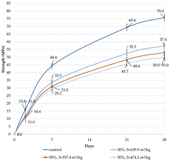 The effect of the specific surface area of the filler and its content in the blended cement on the compressive strength at the ages of 2, 7, 21, and 28 days of hardening is presented. The content of the filler in blended cement was 10, 30, and 50%. According to [33], blended cements with 20% dolomite and limestone filler have lower compressive strengths than the reference binder, at any age, as reported in previous studies. It was found that the highest strength at the age of 28 days is achieved with 10% dolomite filler with a specific surface area of 639.9 m2/kg (79.9 MPa) compared to pure Portland cement (76.0 MPa). The specific surface area has a strong influence on the properties of the blended binder.