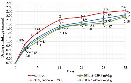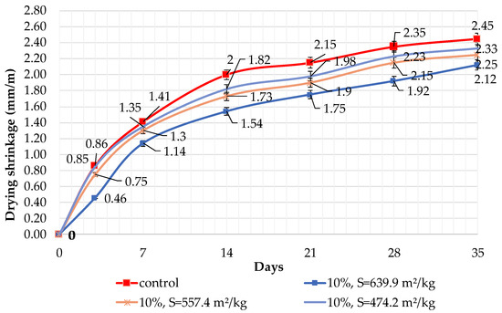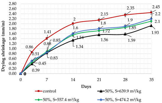 The results of shrinkage tests are shown in Figure 9, Figure 10 and Figure 11. It was determined that linear shrinkage after 35 days for cement containing dolomite filler is lower than for pure Portland cement. The composition with 50% filler with a specific surface area of 639.9 m2/kg has the minimum shrinkage. In this case, the shrinkage index is 21% less than the pure cement. The maximum linear shrinkage is demonstrated by Portland cement and a composition with 10% dolomite filler with a specific surface area of 474.2 m2/kg.