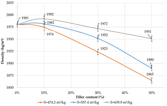 Figure 12 shows the effect of the specific surface area of the filler and its content in the blended binder on the average density of cement paste. The use of dolomite filler reduces the average density of blended cement if the substitution rate is 30 and 50%. The average density of blended binder with a specific surface area of 639.9 m2/kg increases if the content of the filler is 10%. This can be explained by the chemical activity of the dolomite filler and the formation of a more dense cement paste structure that corresponds with an increase in strength (Figure 6). If the content of the filler is 10% and its specific surface area is 557.4 and 474.2 m2/kg, the composition has a similar average density as pure Portland cement.