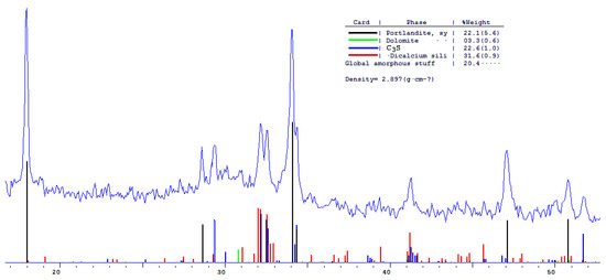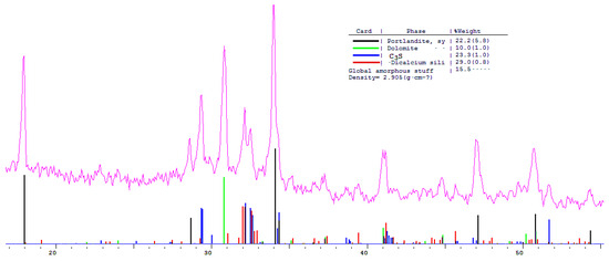 The phase composition of hydration products of Portland and blended cements with 10 and 30% dolomite filler with a specific surface area of 639.9 m2/kg was researched. The analysis of the XRF data showed that at the age of 28 days of standard curing condition, in addition to hydrate phases, such as Ca(OH)2 and X-ray amorphous calcium hydrosilicates, the main clinker minerals alite (C3S) and belite (C2S) are present in all samples (Figure 13, Figure 14 and Figure 15).