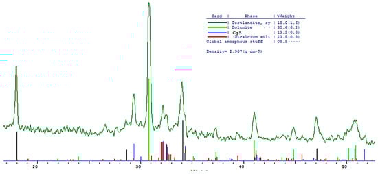 A quantitative phase analysis showed that the sample with 30% dolomite filler contains 26% Ca(OH)2; 19% C3S (alite); 22% C2S (belite); and 8–10% amorphous phase. The sample with 10% dolomite filler contains 28% Ca(OH)2; 21% C3S (alite); 26% C2S (belite); and 15% amorphous phase. The pure Portland cement sample consisted of 33% Ca(OH)2; 21% C3S (alite); 28% C2S (belite); and 18–20% amorphous phase.