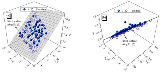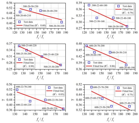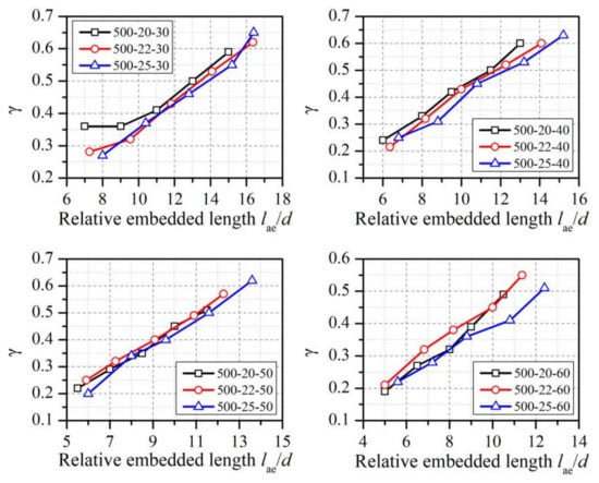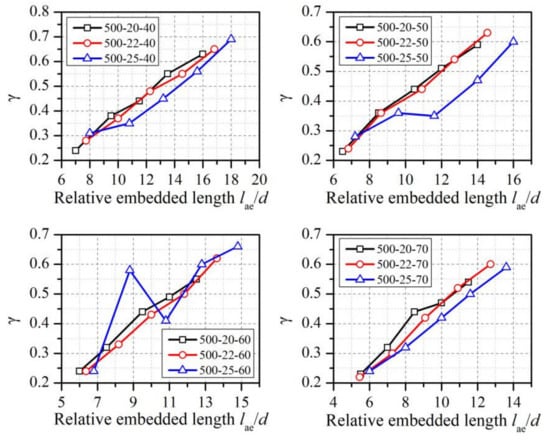 - The correction coefficient γ would increase with an increase in the relative embedded length of the reinforcement lae/d (on average, 146% higher than the initial value) and decrease with an increase in the fy/ft (on average, 33% less than the initial value), with an obvious linear relationship. A formula for γ with lae/d and fy/ft as independent variables was established.