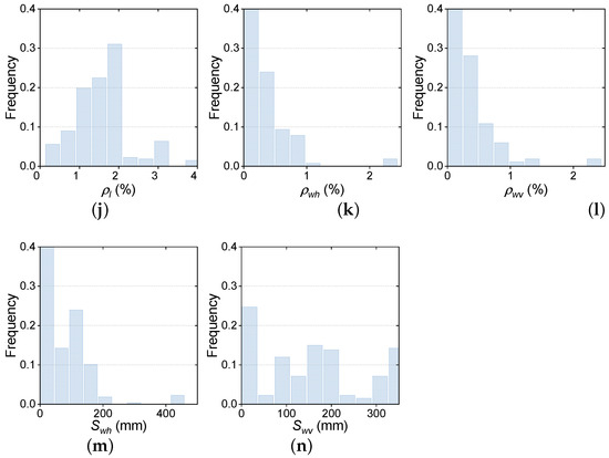 Marginal distributions of the input factors in the deep beam shear database: (a) L. (b) a. (c) h. (d) . (e) b. (f) . (g) . (h) . (i) . (j) . (k) . (l) . (m) . (n) .