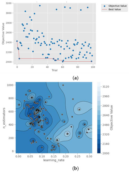 Optimization process of NGBoost’s hyper-parameters: (a) Optimization history. (b) Optimization contour of two basic hyper-parameters.