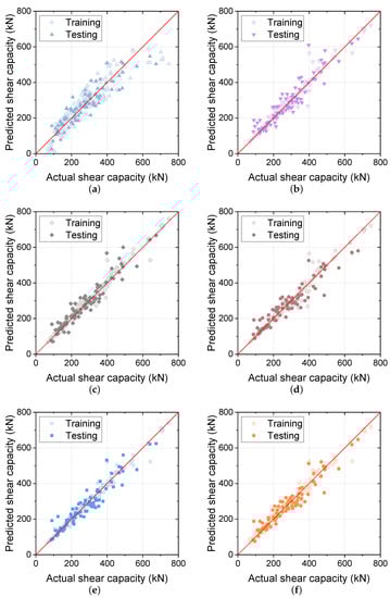 Scalar prediction performance of models on deep beam shear database: (a) Linear regression. (b) Support vector regression. (c) Neural network. (d) Random forest. (e) XGBoost. (f) NGBoost.