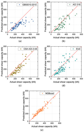 To further illustrate the superiority of the NGBoost in shear capacity prediction, several empirical formulas globally adopted in current design codes were used for comparison. In this section, the prediction formulas from the codes in China, the U.S., Canada, and Europe were selected [45,46,47,48], as listed here: