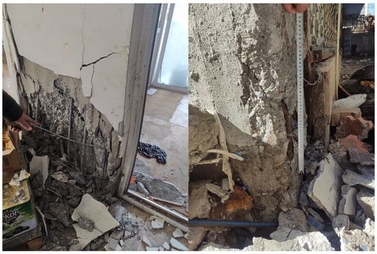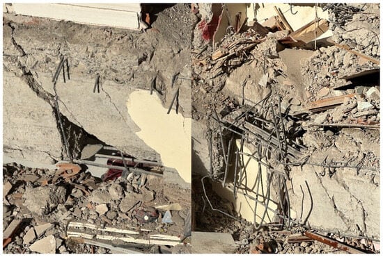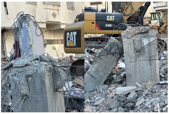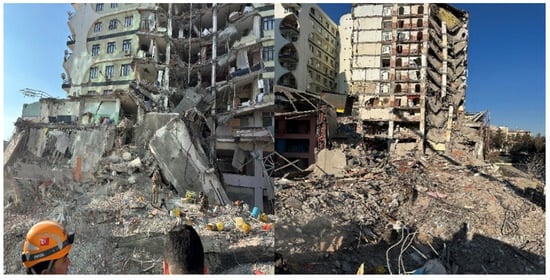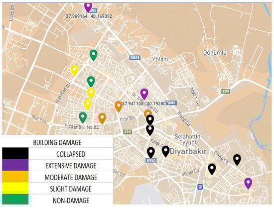 Earthquake amplitudes decrease in parallel with the distance–decay relationship as one moves away from the earthquake focal point, and accordingly, lower values were expected to be observed in Diyarbakır. However, the unexpected disproportionate destruction, damage and loss of lives in response to these low acceleration values raise some questions. In the observations made in the field after the earthquake, the presence of many structural defects, especially low-strength concrete and poor steel reinforcement, are noteworthy. In Diyarbakır province, the locations of a total of 18 buildings, including the building shown in