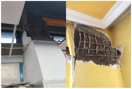 Figure 8 shows the undamaged ground floor columns of the completely collapsed building. The slender column rising after the column with an exceptionally large cross-section might indicate that this building was subjected to an insufficient retrofitting process. Some damage examples of inappropriate shear walls and columns are illustrated in