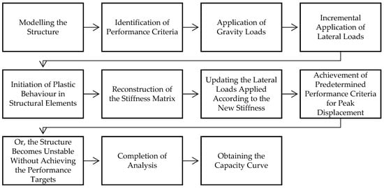 The analysis steps of pushover analysis as a performance-based evaluation method that estimates the structural responses to seismic loads by applying a series of increasing lateral loads are shown in