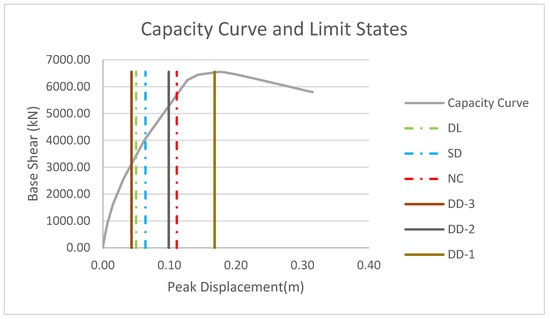 Table 4. The fundamental period of the structure was 0.8271 s; the maximum base shear was 6557.27 kN; the elastic stiffness K_elas and the effective stiffness K-eff were obtained as 120,492.20 kN/m and 63,600.91 kN/m, respectively.