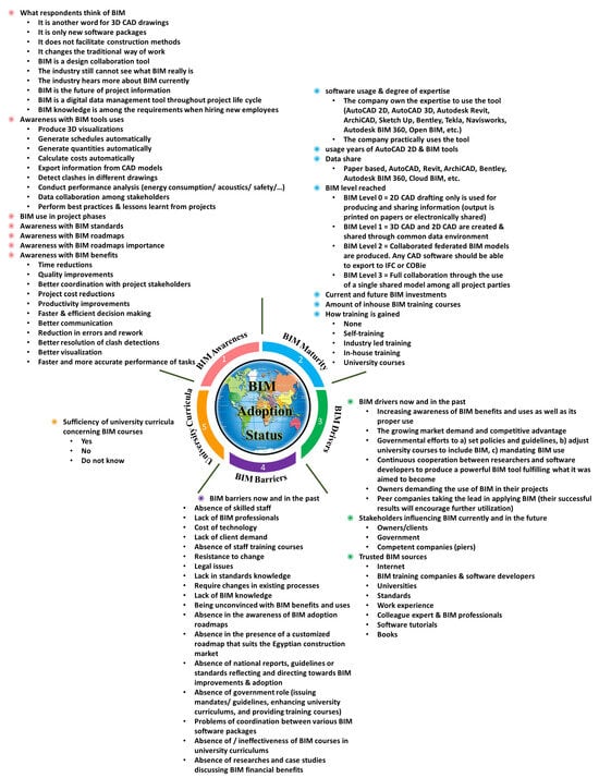 - Two experts recommended adding ‘Human Psychology’ as a dimension or indicator where people’s skill to use BIM is to be assessed. However, human psychology in using BIM is assessed under all the dimensions: (a) the BIM awareness dimension: assessing individuals’ awareness with, for example, BIM benefits is a reflection of being internally convinced that BIM can perform a change; (b) the BIM maturity dimension: assessing the degree of BIM tools’ usage, how data are shared, the degree of compliance between required BIM knowledge and actual available skills, and the meaning of gaining BIM training. All of these indicators are a reflection of an individual’s skills and maturity; (c) the BIM drivers dimension: if BIM is derived in the market through different stakeholders and investments are being assigned for BIM enhancement, then humans are psychologically convinced with BIM; (d) the BIM barriers dimension: different barriers are being assessed, among which is the degree of convincement with BIM; and (e) the university curricula dimension: if universities provide future pioneers with the required BIM courses, then their skills should be enhanced and will influence the construction market afterwards.