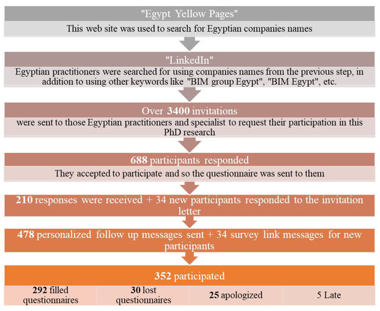 Data were collected using LinkedIn. Firstly, “Egypt Yellow pages” website was used to search for company names, which were used as keywords on LinkedIn, as well as other keywords such as “BIM Group Egypt”, “BIM Egypt”, “BIM coordinator Egypt”, etc. The detailed data collection process is summarized in the flow chart presented in Figure 5.
