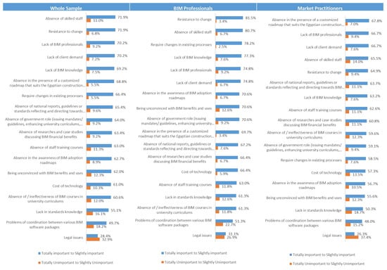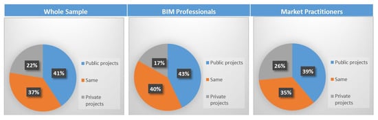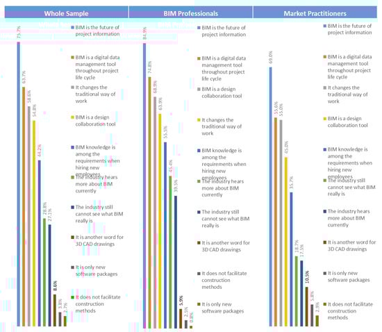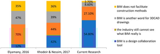 The analysis revealed the conviction and awareness of the Egyptian market’s stakeholders with BIM, the understanding of the true meaning of BIM, and how positively it could change the market (Figure 6). However, a significant difference existed between BIM professionals and market practitioners in the degree of understanding what BIM really is. BIM professionals believe more in BIM and understand what effect BIM can have on the construction market more than other market practitioners. However, there existed no association between the different number of years of experience or company size the participant’s degree of understanding of what BIM really is. Yet, some association existed between the different company types and the participant’s degree of understanding of BIM.