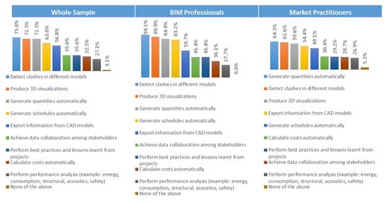 Though BIM professionals use BIM tools more than market practitioners, different Egyptian market stakeholders are aware of BIM uses; some stakeholders widely apply BIM for different purposes. However, some applications and uses should be enhanced to reach a higher level of BIM. BIM is mostly used to detect clashes, produce 3D visualizations, and automatically generate quantities and schedules (Figure 7). It appeared that there existed no association between the usage of BIM for different purposes and company size, company type, or years of experience.