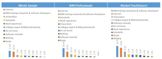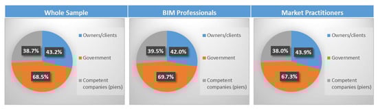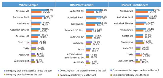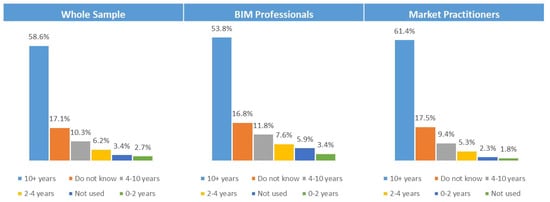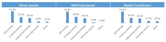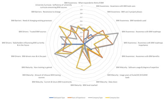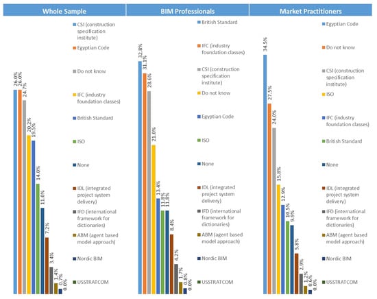 Descriptive and inferential analyses were executed to analyze the data collected for each indicator present in the CMBAS tool. The Microsoft Excel and the SPSS programs were used to perform descriptive and inferential analyses. The sample was divided into three clusters: whole sample, BIM professionals, and market practitioners. Furthermore, each cluster was further analyzed based on three criteria: years of experience (from 0 to 5 years, more than 5 to 10 years, more than 10 to 20 years, and more than 20 years), company type (owner, consultant, contractor, and others), and company size (small, medium, and large). Several tests were used in the inferential analysis: Mann–Whitney test, paired Mann–Whitney test and Kruskal Wallis test for determining the presence of difference between variables of non-parametric data. Also, the Chi squared test, Phi test, and Cramer’s V tests were used to detect the presence of association between variables. [109,110,111,112,113,114,117,118,119]. Moreover, reliability of data (the degree of bias or error present in the collected data) was tested through using internal consistency test and calculating Cronbach’s alpha value [108].
