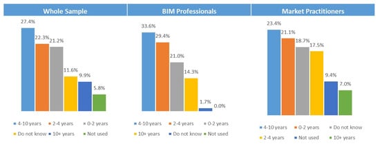 BIM professionals’ percentages of using BIM in each of the project phases are totally higher than other market practitioners, especially in the detailing, construction, and fabrication phases. Nevertheless, the construction, detailing, and design phases are the phases mostly using BIM. In contrast, there existed no association between different years of experience and the use of BIM in the different phases except for the detailing phase, where experienced participants having between 10 and 20 years of experience have more BIM users in this phase. Company type criteria showed an association with the use of BIM in the concept, fabrication, and design phases; as the owners are the ones who put forth the concept: that is why they use BIM the most in the concept phase. Furthermore, contractors are usually responsible for the construction of the project: that is why they use BIM the most in the construction and fabrication phases. Similarly, the design is mostly performed in the Egyptian construction market by consultants, which was revealed in the analysis, where consultants most often use BIM in the design phase. Finally, there existed no association between different company sizes and the use of BIM in different project phases except for the design phase, where large companies have the highest frequency of using BIM in the design phase.