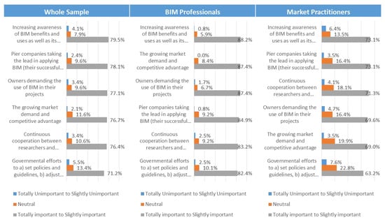- A total of 75% of the experts agreed that BIM dimensions are sufficient to comprehensively detect markets’ BIM status, whereas 25% had a neutral opinion.