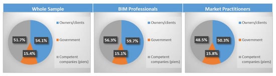 The sample consisted of 292 participants representing two groups: 119 BIM professional (BIM engineer, BIM developer, MEP technical coordinator, BIM manager, etc.) and 171 market practitioners (structural engineer, site engineer, technical office engineer, etc.). This sample size is justified according to Cochran’s equation ((presented in [110,115,116]). If precision e is to be ±6%, then sample size should be 267. Moreover, based on Cooper and Schindler’s (2014) [113] nominal ordinal data, the sample size is equal to 96. Also, based on the rule of thumb, the sample size should not be less than 30 [111,112].