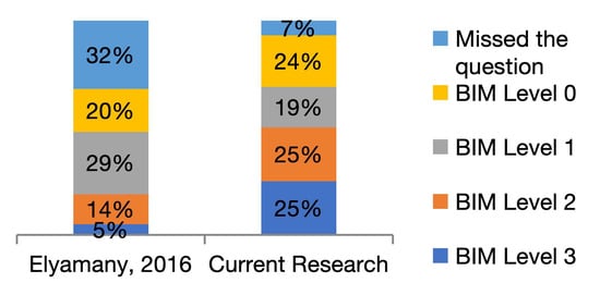 However, for survey papers exploring BIM implementation in Egypt, there existed six sources [2,9,31,33,90,91,92]. However, each survey focused on certain areas, lacking to reflect the overall image of BIM status in the Egyptian construction industry. That is why, here, the proposed tool is applied to the Egyptian Construction market, and the results are illustrated in the following section. Afterwards, results were compared to these previous survey papers’ results in an attempt to benchmark BIM in Egypt throughout the years.