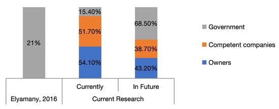 The Egyptian construction industry is characterized by being highly dynamic. After many years of recession, the industry has seen a boom since the 1980s moving towards the 2010s, with a growth of about 9% in 2015, and 8% in 2016 [72,73]. Investments in the Egyptian construction industry are mainly from the private sector, with a range from 75% in 2015 to 60% in 2016 [74]. Also, the total investments in 2016 in the construction sector increased three times more than the value in 2015 [74]. Government projects represent 50–80% of the projects in Egypt—half of which is financed by foreign entities, while the other half is locally financed [75].