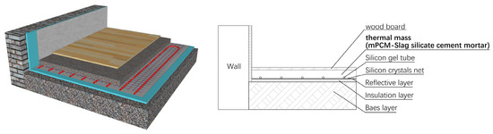 In this study, a specific process was used to introduce mPCM particles into slag silicate cement mortar with the main objective of analyzing the thermal properties of slag silicate cement mortar thermal storage blocks with the addition of a mPCM, contributing to the existing knowledge on the use of a mPCM in mortar and its further application to radiant floor heating systems (Figure 1). The first part of the study introduces the materials, the preparation process of the thermal storage blocks, and the thermal performance test methods and procedures. The second part focuses on the experimental results, with an analysis of the evolution of the thermal characteristics of the slag silicate cement mortar with respect to the PCM particle content. Finally, the main achievements are summarized in the Section 4.