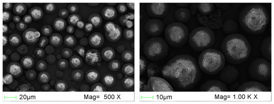 Figure 4 shows SEM images of the mPCM particles at 500× and 1000× magnifications, indicating that mPCM particles exhibit a spherical shape. Furthermore, the SEM images reveal the presence of broken resin shells at a magnification of 1000×. These broken resin shells were detected alongside the mPCM particles, which appear irregular in shape, as observed at a magnification of 500×. It is possible that these irregularly shaped particles were formed during the fabrication process of the mPCM particles.